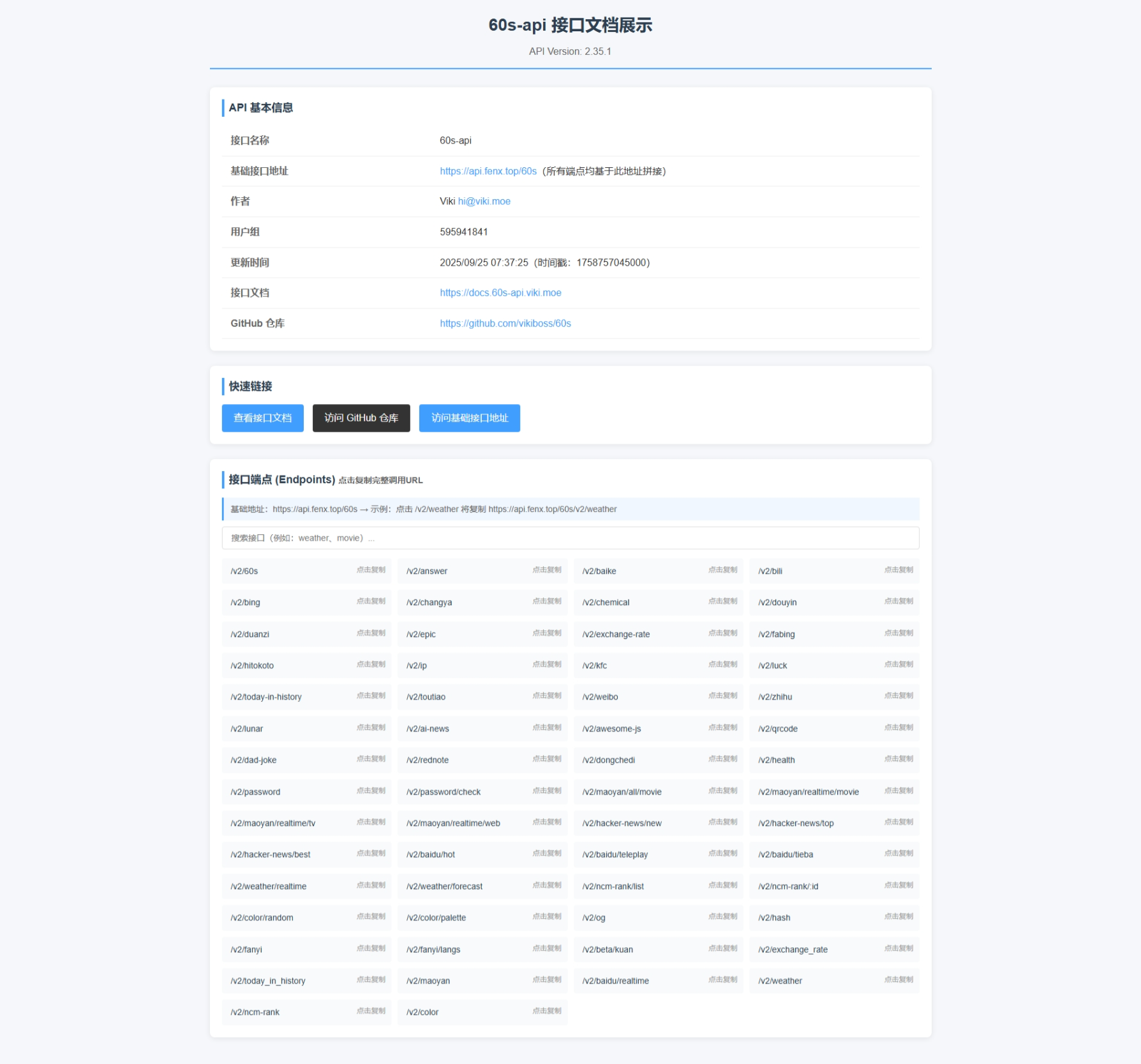 通过 60s-api,你可以快速实现天气展示、热点新闻聚合、影视排行榜、二维码生成等功能,极大减少开发时间和成本。