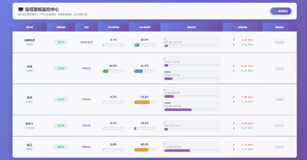 AI 编写的一个服务器监控源码接口使用的宝塔面板 api,被监控机器需要安装宝塔面板将压缩包上传至站点解压,修改“servers.php”内链接信息即可