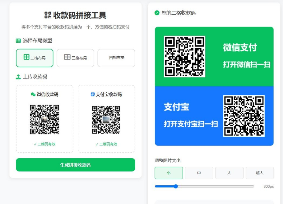 上传相应二维码,然后点生成,在右侧就可拼接出我们需要的二维码。