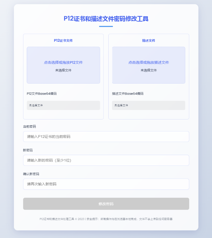 现在证书越来越多的人,这是一款证书P12密码修改单页源码,修改成功之后自动下载附件到本地,喜欢的自行部署吧!