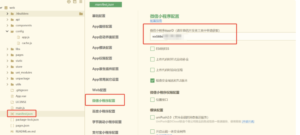 通过 HBuilder x打开源码的 web文件,打开 manifest.json 找到小程序配置