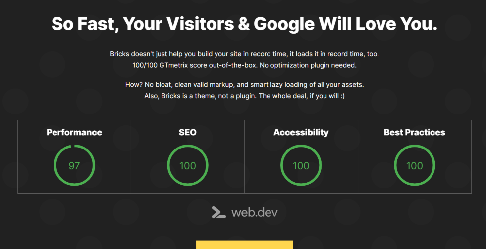 Bricks 不仅可以帮助您在创纪录的时间内构建网站,还可以在创纪录的时间内加载网站。开箱即用的 100/100 GTmetrix 分数。无需优化插件。