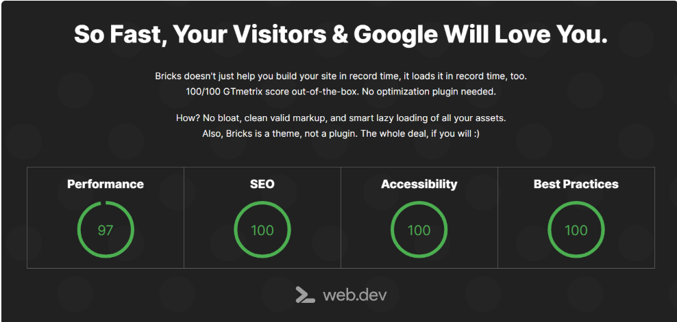 Bricks 不仅可以帮助您在创纪录的时间内构建网站,还可以在创纪录的时间内加载网站。开箱即用的 100/100 GTmetrix 分数。无需优化插件。