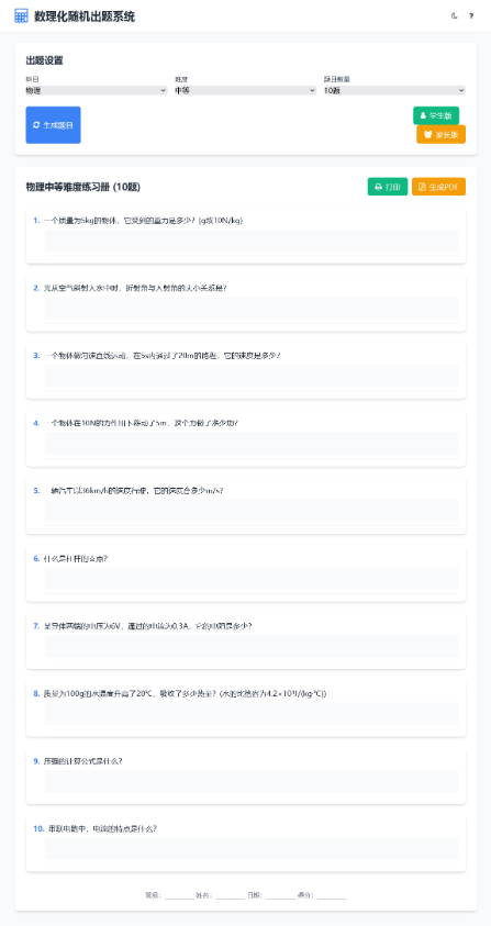 支持数学、物理、化学三个科目的随机出题