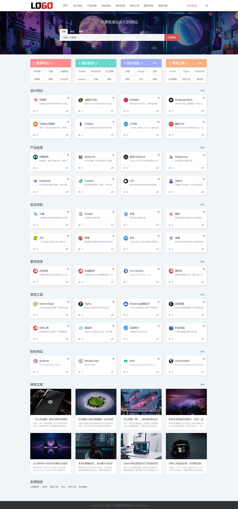 该模板专门用于展示、分类、检索各类网址资源的 Web 模板,核心功能是网址收纳、分类导航、快速访问,适用于搭建行业网址导航、垂直领域资源库、企业内部链接平台等场景。。