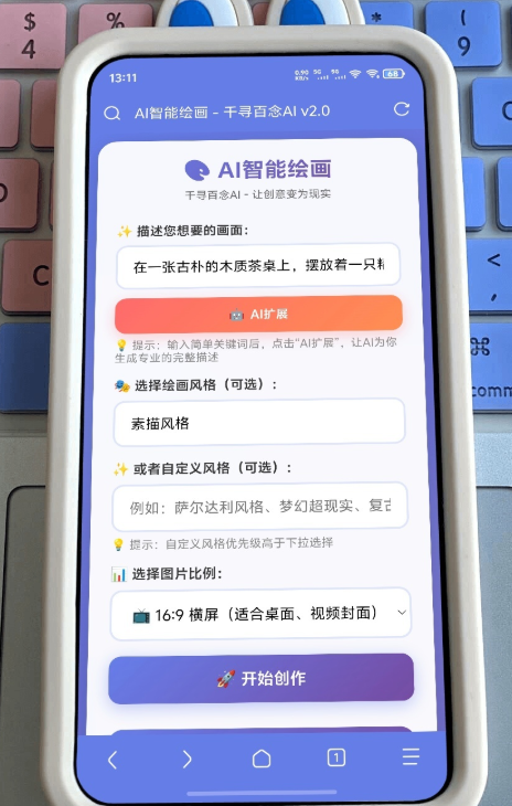 AI自动扩展:输入简单关键词(如”猫”、”森林”、”夕阳”),AI自动扩展成80-120字的专业绘画描述