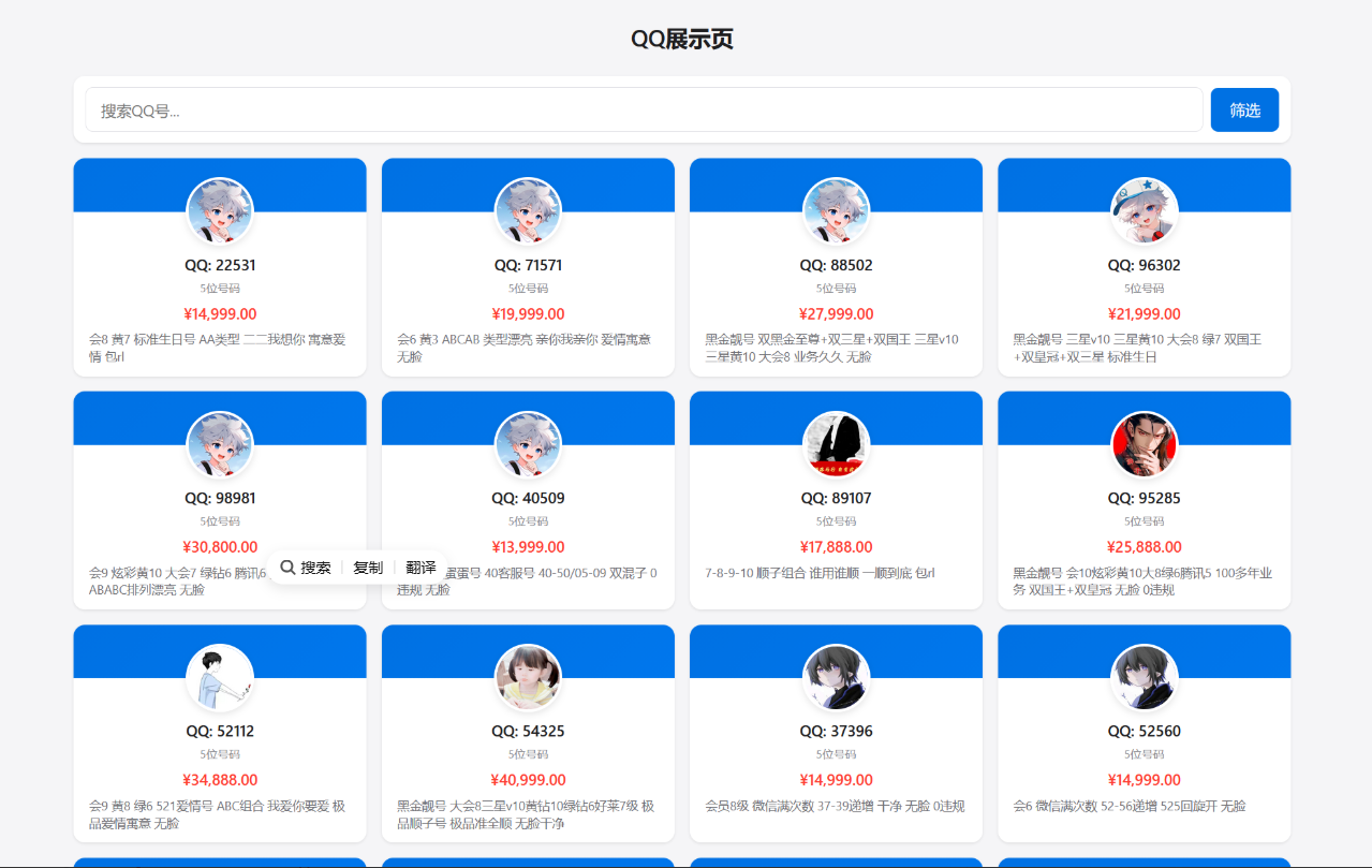 这是一款功能完整的靓号展示与售卖网站源码,适用于 QQ 号、车牌号、手机号等数字资产的在线展示。