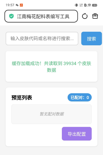 这是一款用于编写江南梅花配料表的工具,支持在Web服务器环境下运行。用户可通过该工具进行皮肤数据的配对、搜索和导出操作。工具要求服务器已配置基础Web服务,无需额外插件即可使用。使用时需将主文件和数据文件上传至服务器根目录,通过浏览器访问即可开始操作。
