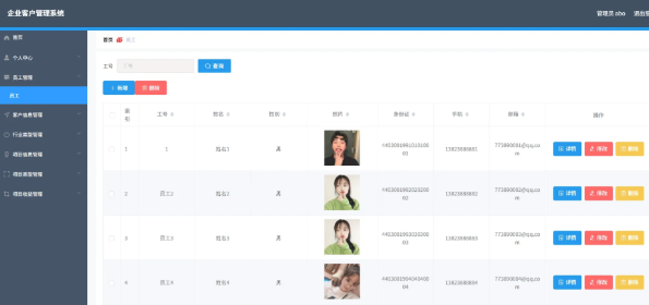 企业客户管理系统的主要使用者分为管理员和员工,实现功能包括管理员:首页、个人中心、员工管理、客户信息管理、行业类型管理、项目信息管理、项目类型管理、项目收益管理,员工:首页、个人中心、客户信息管理、项目信息管理、项目收益管理等功能。由于本网站的功能模块设计比较全面,所以使得整个企业客户管理系统信息管理的过程得以实现。