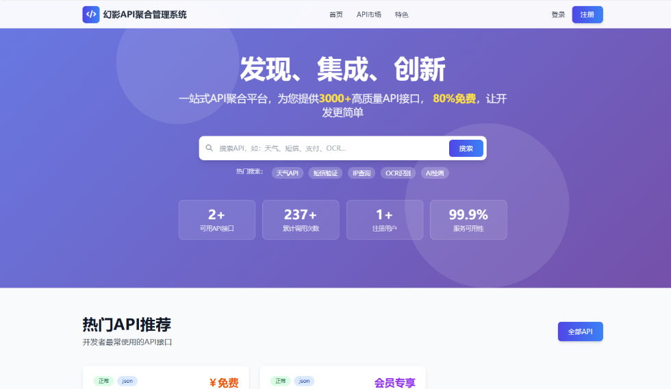 系统内置完善的用户管理系统,支持用户注册、登录、API密钥管理、余额充值、套餐购买等功能。用户可以查看自己的调用记录、消费明细和账户余额。系统自动统计每个API的调用次数、成功率和响应时间,为管理员提供数据支持。