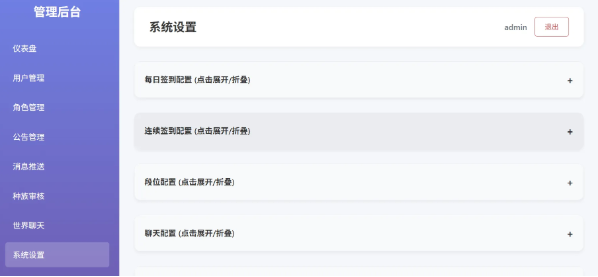 签到配置:设置每日签到的奖励内容(金币、经验、道具等)。