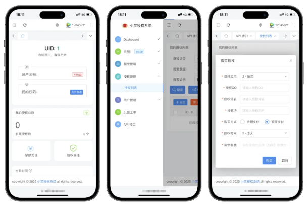 - 支持卡密授权,支持自助更换授权,支持 API 授权接口